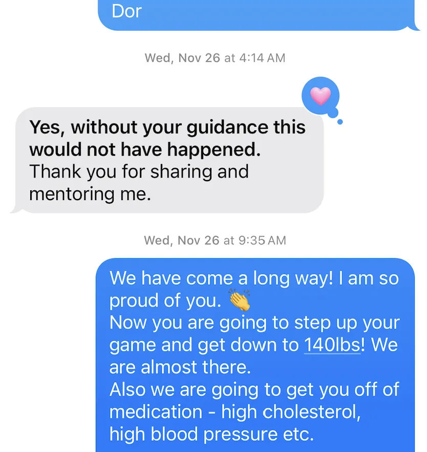 “ Dor helped me during a season when I truly needed it. I was strong and successful, but not healthy—low energy, brain fog, and feeling heavy after every meal. Dor completely changed how I think about health through simple habits, better food choices, and treating the body as a temple. The result was more clarity, better energy, and stronger performance in both business and family life. Working with Dor has been a game changer, and I highly recommend him.”